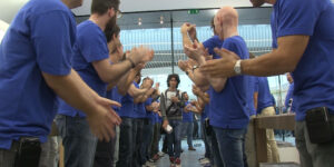 Scene da stadio, nell’anfiteatro della Mela di Cupertino. Decine di persone arrivate da tutta Italia e dall’estero hanno passato la notte accampati a terra, in centinaia si sono presentati all’alba e sono stati in coda per ore sotto il sole, borracce e telefonini in mano, tra transenne e controlli della polizia in una piazza del Liberty blindata come fosse il concerto di Capodanno. Alle 17 in punto nel cuore di Milano Apple ha spalancato le porte del suo store, tra i più grandi al mondo, salutato da migliaia di scatti e di clic.